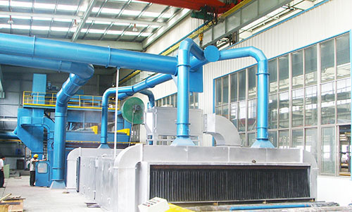 拋丸清理機工作時產(chǎn)生的含塵氣流經(jīng)過管道進入袋式除塵器。含塵氣流在除塵器的作用下形成旋風,大顆?;覊m降在灰斗內(nèi),帶有小顆粒的灰塵氣流經(jīng)布袋過濾后,通過高壓離心式通風機進入煙筒,排放的粉塵濃度不高于120mm/m3。